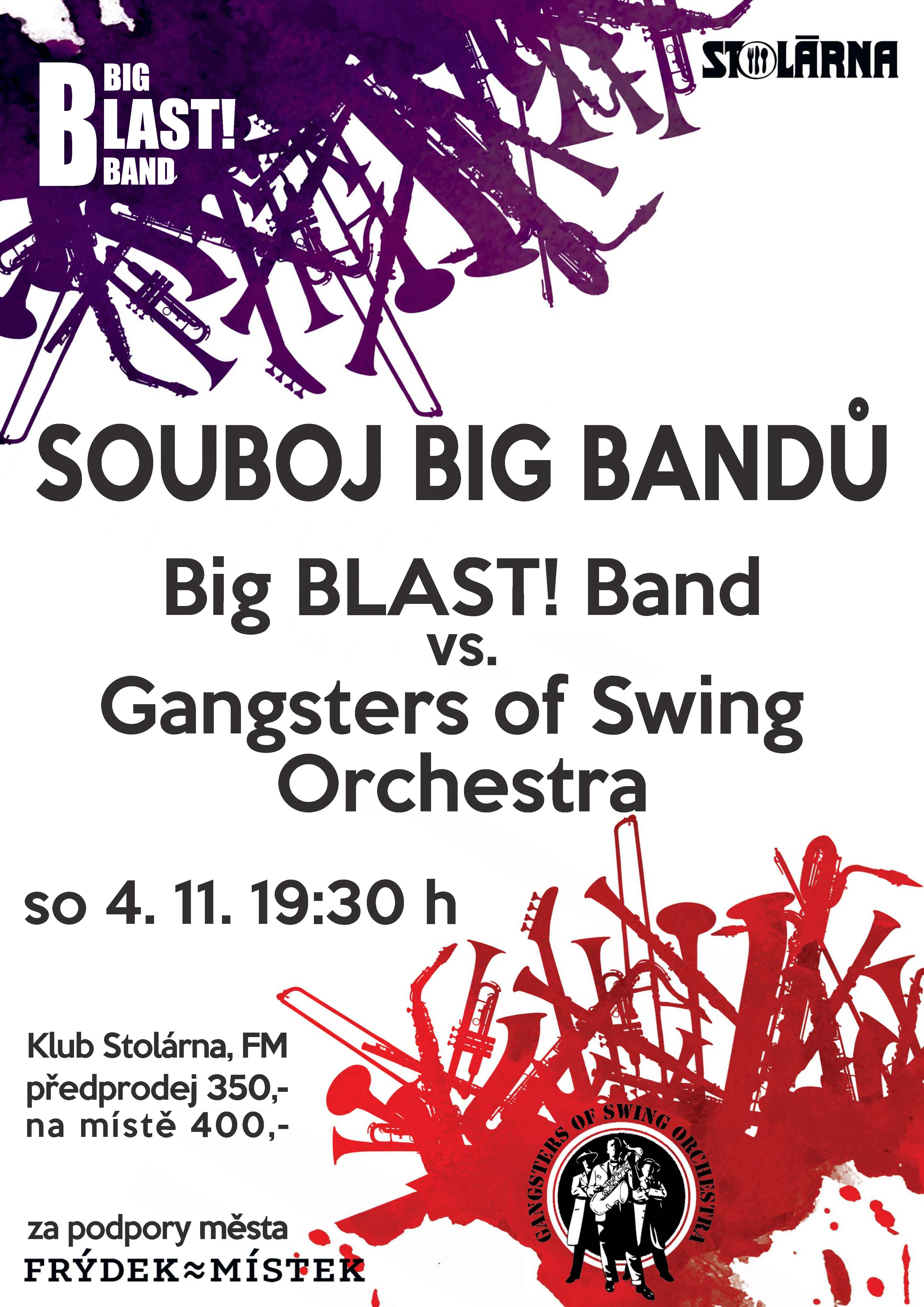 Tentokrát domácí Big BLAST! Band vyzval na souboj Gangsters of Swing Orchestra. Souboj to bude nelítostný a protáhne se do noci a jestli nechcete přijít o pořádnou dávku (či snad rovnou nakládačku) big bandové muziky od swingu po funk, nesmíte u toho chybět.
